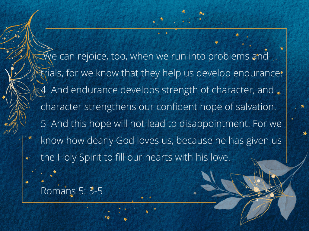 3 We can rejoice, too, when we run into problems and trials, for we know that they help us develop endurance. 4 And endurance develops strength of character, and character strengthens our confident hope of salvation. 5 And this hope will not lead to disappointment. We know how dearly God loves us because he has given us the Holy Spirit to fill our hearts with his love. Romans 5:3-5